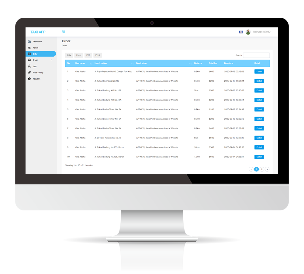 The information placed and ordered on the taxi dispatch app is automatically stored in the back-end system. Operations managers can keep track of user order status and driver information in real time. Order date, time, user name, driver name, pickup location, destination, distance and total cost are all displayed on the management screen, making it easy to manage the app’s operations.