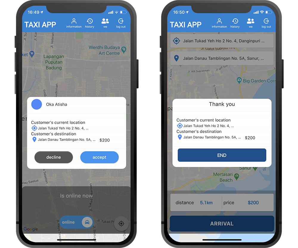 When an order is placed by a user, all drivers who have signed up for the client’s app will receive an order notification from the user. The order notification includes information about the pickup location, destination, and ride price.