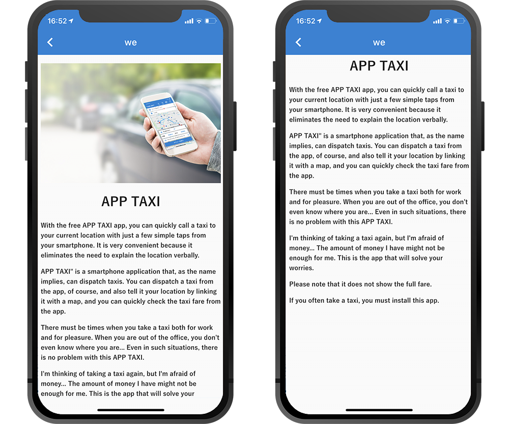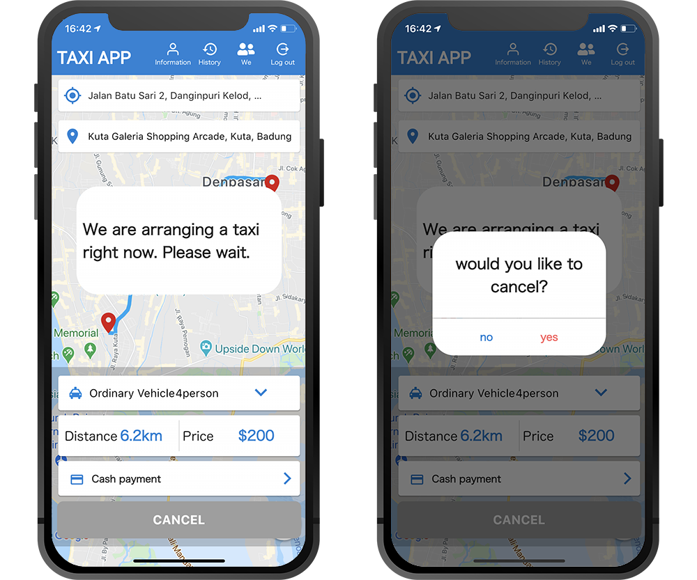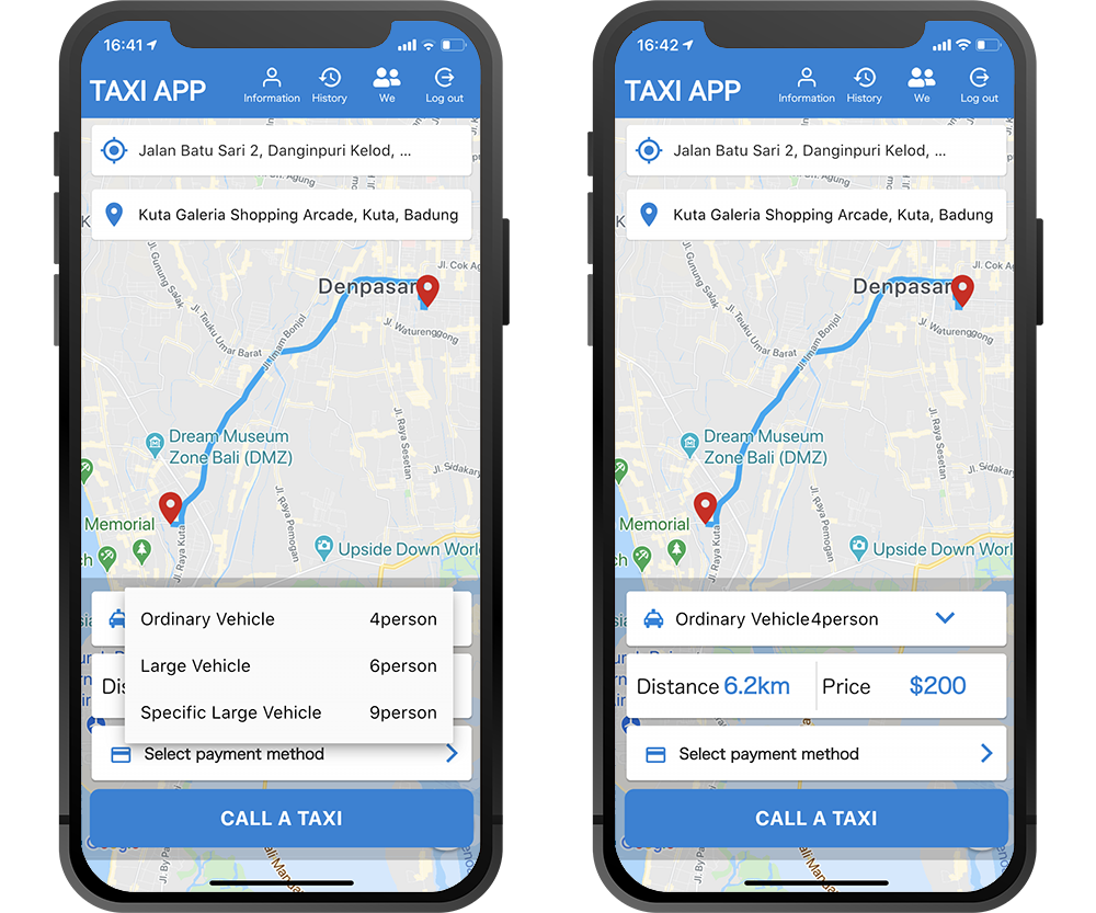 Users enter information such as pickup location, destination, car type and payment method, and then place an order immediately from this taxi dispatch app. The order is sent via push notification to all contracted drivers and the driver is chosen to go to the user on a first-come, first-served basis. The driver communicates with the user via the driver app and heads to the point where the user is to be picked up. The taxi dispatch app also comes with the ability to cancel an order.