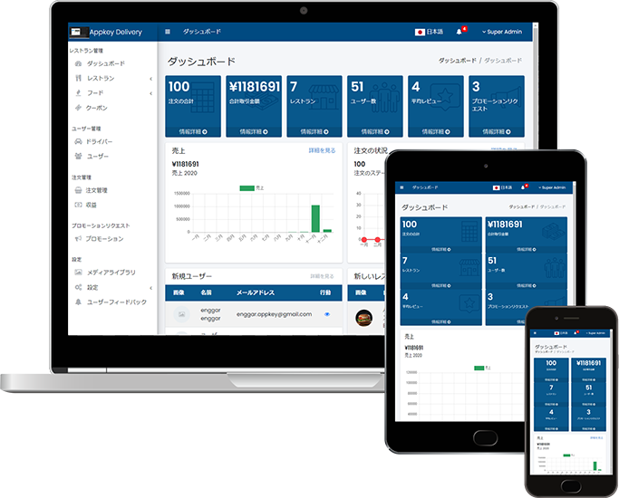 The backend can be used by logging into the WEB that we provide. The delivery app’s backend can be used to manage deliveries for multiple stores ranging from small cafes to restaurants and franchise stores.
